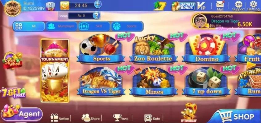 Variety of games: From classical Teen Patti to slots and modern games like Dragon vs Tiger, you get endless choices.