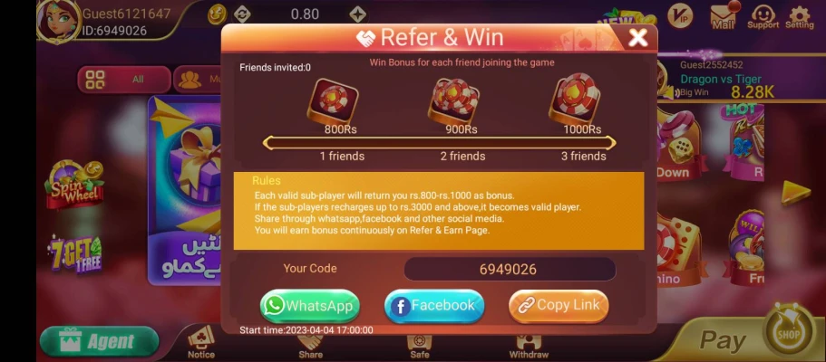 The referral system is one of the most popular features. Players can copy a referral link and share it through Facebook, WhatsApp, or Telegram. Each referral earns you up to 30% commission, which adds another stream of income.